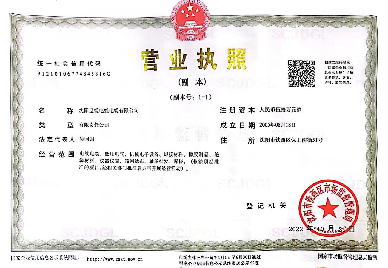 沈陽遼纜電線電纜公司資質(zhì)